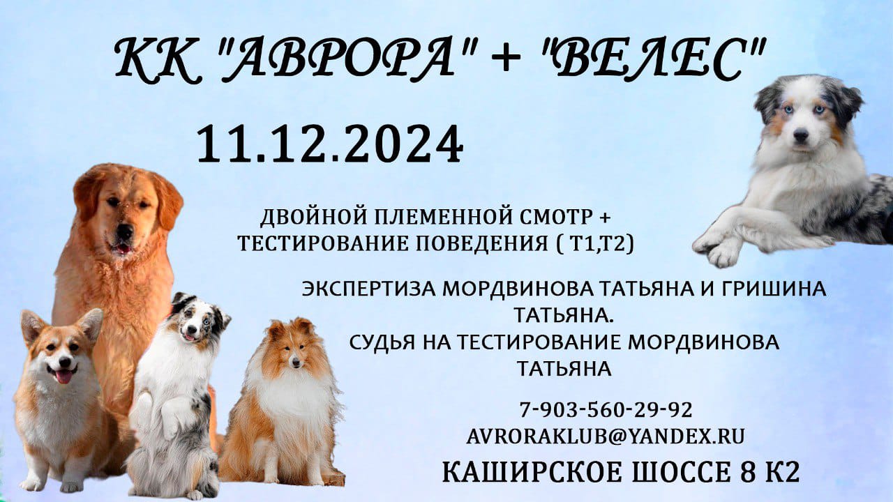 приглашает действительных и потенциальных членов клуба принять участие в зоотехнических мероприятиях: ДВОЙНОМ ПЛЕМЕННОМ СМОТРЕ и ТЕСТИРОВАНИИ ПОВЕДЕНИЯ Т1/Т2. Успешное прохождение этих трех мероприятий дает собаке пожизненный допуск к племенному разведению. Место проведения: КК «Аврора» Москва, Каширское шоссе д.8 к.2